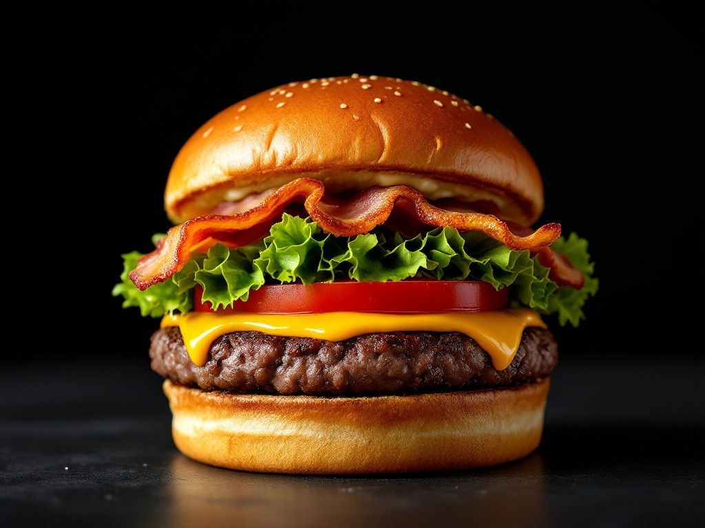 O Burger Iphome com bacon é um hambúrguer com carne artesanal de 100g com pão tostado na manteiga, queijo cheddar, bacon crocante em fatias, molho especial, tomate e alface.