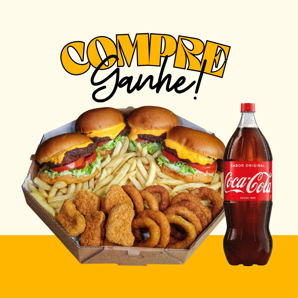 👉 Serve até 4 pessoas 🍔 4 hambúrgueres artesanais 🍟 Batata frita crocante da casa com recheio gratuito 🥟 2 petiscos inclusos para acompanhar